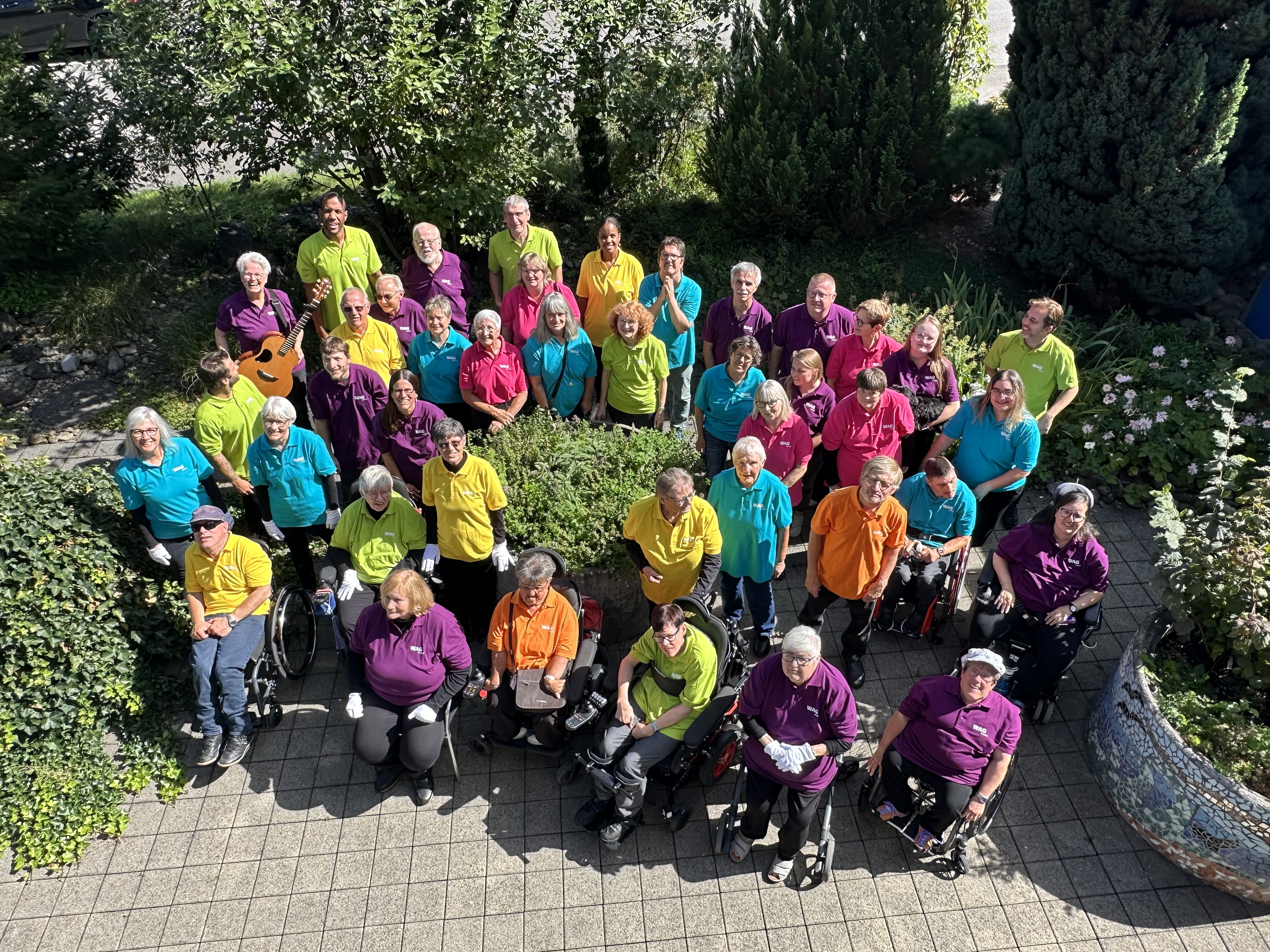 1991 wurde die Stiftung in «Wohn- und Arbeitsgemeinschaft für Körperbehinderte Gwatt (WAG)» umbenannt. Heute stehen 45 Zimmer für Bewohner:innen, ein Ferienzimmer sowie über 60 angepasste Arbeitsplätze für IV-Bezüger:innen in den Bereichen Produktion, Dienstleistungen und Atelier zur Verfügung. Das Angebot der Stiftung ist vielfältig: von Planung und Konstruktion, 3-D-Druck, Bürodienstleistungen, Gastronomie und Spitex bis hin zu Lingerie und Kunsthandwerk, um nur einige Beispiele zu nennen. Die Bewohner:innen organisieren Anlässe und wirken in Freizeitgruppen mit. Auch die Musikgruppe «WAGmusic!» ist ein Ergebnis der gelebten aktiven, gemeinsamen Freizeitgestaltung. Sie wurde 1997 gegründet und hat seither mehrere CDs aufgenommen sowie unzählige Konzerte gespielt. 2010 unterstützte die AEK BANK 1826 den Traum der Musiker:innen mit einer Spende, als die «WAGmusic!»-Konzerttournee bis nach Kalifornien führte. 2017 reiste die Gruppe für Auftritte nach Eastbourne, England. Auch heute proben die Mitglieder der «WAGmusic!» jeden Mittwochabend.